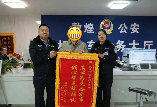 近日,敦煌市某企业负责人将一面写有“真心为民办实事 倾心替民解烦忧”的锦旗送到敦煌市公安局车辆管理所。此前,该企业因大批新车急需办理注册登记业务,向车管所求助。敦煌公安立即启动“绿色通道”,通过预约办理、批量受理、延时服务,以最快速度办结全部手续,解了企业的燃眉之急。