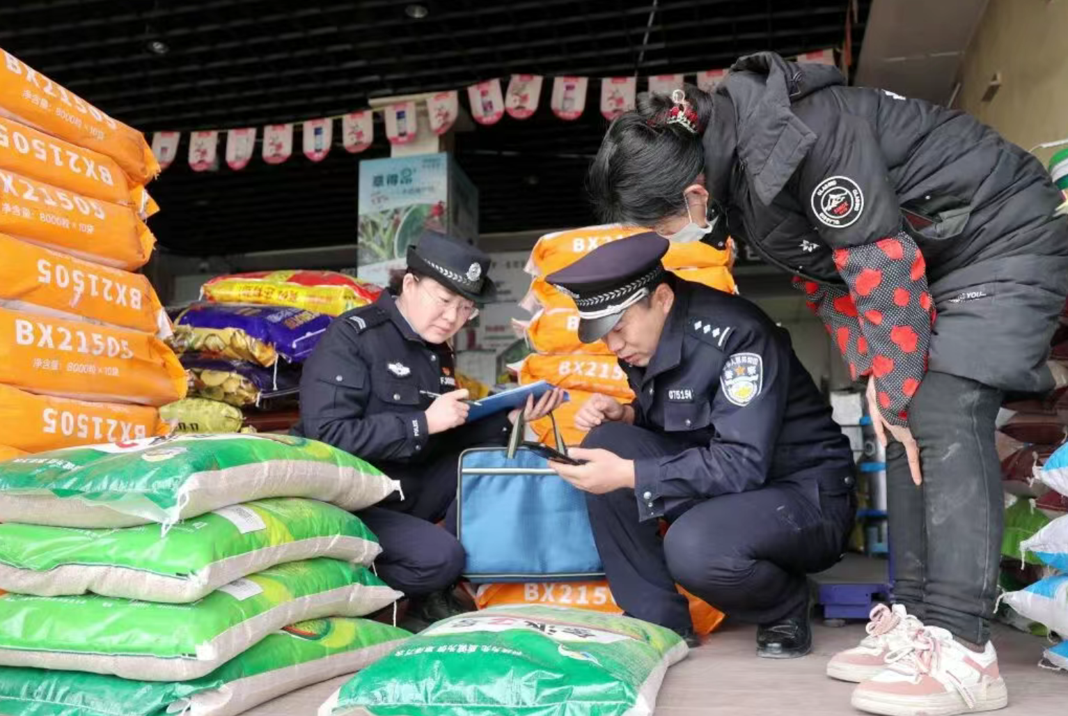 ▲张掖市高台县公安局环食药侦大队组织民辅警深入辖区农资销售点,对种子、化肥、农药等重点农资产品开展专项检查。(蒋雯丽 摄)