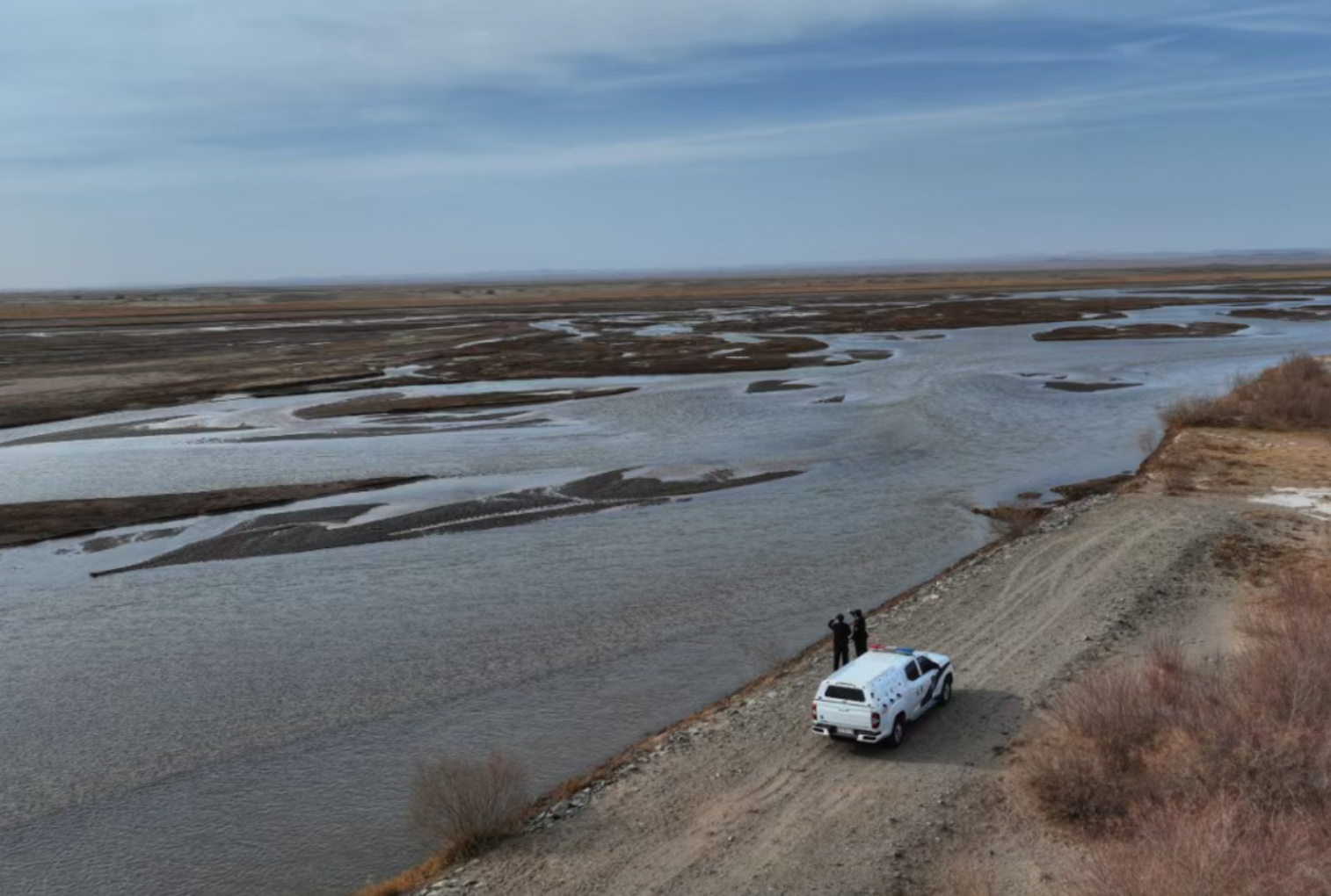▲酒泉市金塔县公安局鼎新、航天派出所组织民警辅警深入辖区草场、河流、湿地等区域,细致排查倾倒垃圾、破坏植被等违法行为。(葛万誉 摄)